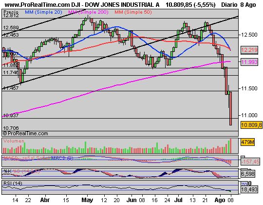 Por su parte, el gráfico del Dow Jones todavía asusta mucho más, fortísimas caídas, y de momento, no hay ningún signo de que al otro lado del Atlántico se van a terminar las caídas, y un volumen altísimo, inusual, con indicadores en sobreventa y mínimos. Podría ser un segundo Lemman Brothers.