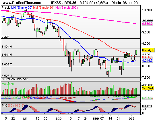 Se reduce claramente la volatilidad en los indicadores, VIX y seguimos la escalada en nuestro selectivo hacia los 8.800 puntos. Reunión de Merkel de nuevo, donde la cancillera da una pista sobre lo que va a proponer. Los tipos de interés se han quedado igual como estaban en la sesión de hoy. Trichet ha mencionado que "todo es posible pero en la situación actual, hemos analizado los pros y contras de tocar o no los tipos, y hemos decidido no tocar nada". Estaríamos ante una posible bajada de tipos de interés en un futuro. No se ha bajado ahora puesto que creemos que se han dado cuenta que ha sido un error el subirlos, y hace nada se ha dado un dato de inflación del 3%.