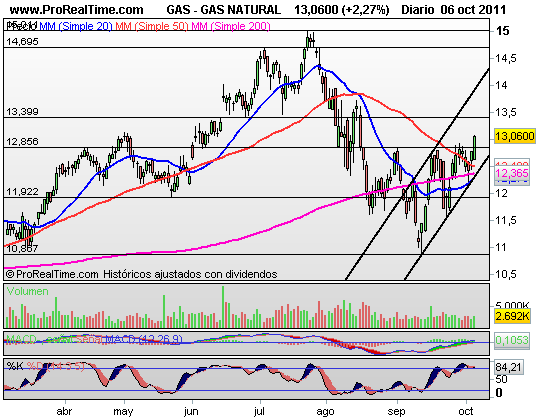 GAS NATURAL: Rotura de niveles de resistencia importantes, rotura del 12.85 euros. Como confirmación, cierre en máximos diarios, preparada para mañana, y en próximas sesiones, atacar máximos de 13.5 € coincidentes con el soporte que se rompió allá en el mes de Agosto. La vuelta es clara y la tendencia alcista acelerada es respetada a la perfección.