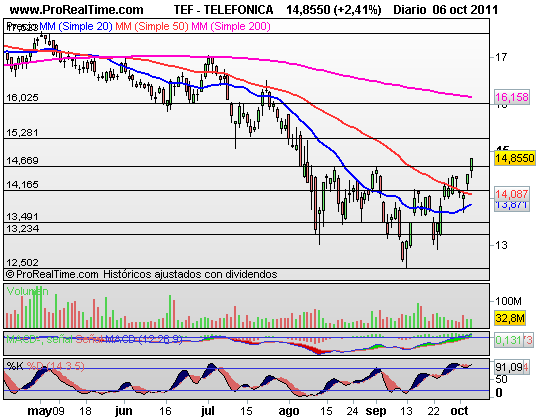 TELEFÓNICA: Excelente comportamiento también en la sesión de hoy, donde ha conseguido una revalorización de casi el 2.5%. ha conseguido romper la doble resistencia que tenía en los 14.65 euros, coincidentes con un doble techo formado. Medias a punto de cortar al alza, con un macd en zona de compra, los 15 euros pueden ser una realidad en la jornada de mañana.