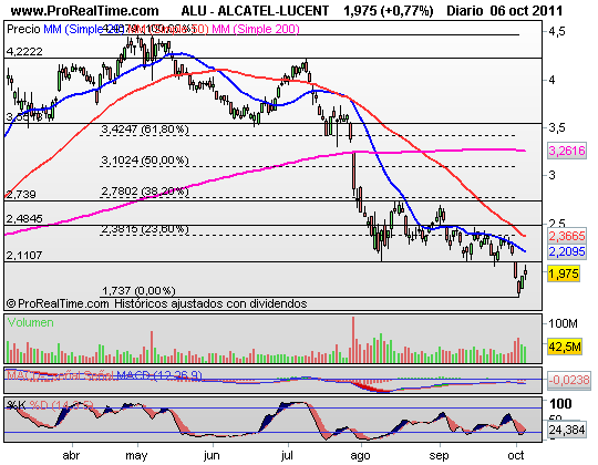 ALCATEL: Hemos visto como el valor ha rebotado con fuerza desde un nivel de soporte muy relevante en 1.72, equivalente al 76.4% del impulso alcista y pensamos que el valor tiene un potencial alcista de corto plazo, con cobertura del hueco bajista generado el día 3 de Octubre, entorno a 2.18 € lo que le da un potencial de revalorización de alrededor de un 10%.