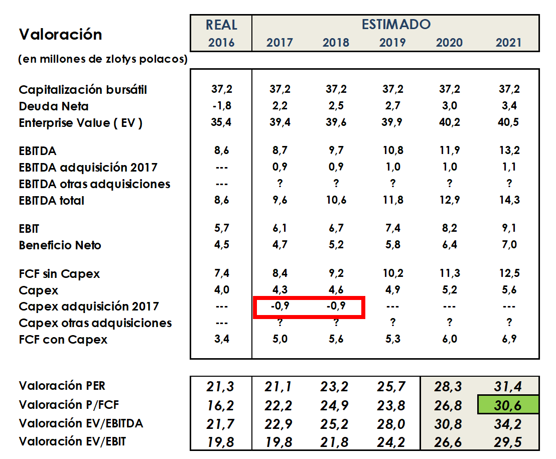 Por otro lado, están entusiasmados por la importancia que cobra a nivel estratégico la adquisición de GiP, la cual supone múltiples oportunidades para expandir el crecimiento de LSI Software. Además, se han mostrado satisfechos con el precio de compra de la operación. Un punto importante a destacar es que, a pesar de que LSI preveía en sus cuentas anuales que la incorporación de GiP les haría reducir el capex de forma significativa (hablaban de reducir las inversiones a la mitad), me aclaran que en 2017 no sólo no se reducirán, sino que incluso pasarán a un nivel más alto. Esto puede venir motivado por un crecimiento por encima de las expectativas. Recordad que, por prudencia, en mi tesis de inversión estimaba una reducción del capex en torno al 20%, sólo para los dos primeros años. Esto variaría de forma sustancial la valoración para 2017 y 2018, aunque continúa intacta a 2021. Esta es la valoración que había realizado en su día, donde he resalta la disminución del capex para 2017 y 2018 como consecuencia de la adquisición: