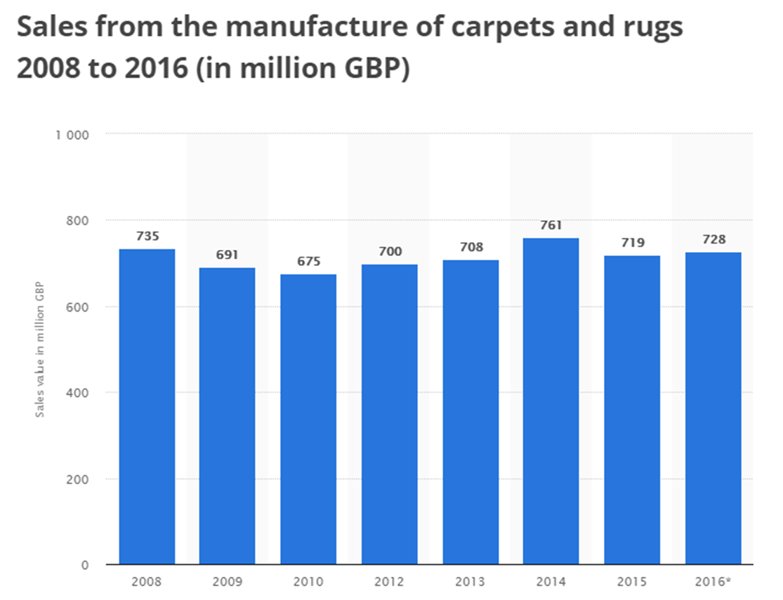 En cuanto a la situación del sector, es muy interesante el hábito consumista que impera en el Reino Unido en productos del hogar. Una de las razones es que los británicos, junto con los nórdicos, son de los europeos que más horas pasan al día en su hogar. La venta de moquetas en Reino Unido, por ejemplo, es un sector muy defensivo y estable, que apenas ha crecido desde el 2008, pero que no se ha visto afectado durante el periodo de la última la crisis económica. En el 2016 generaba un total de 728 millones de libras esterlinas.