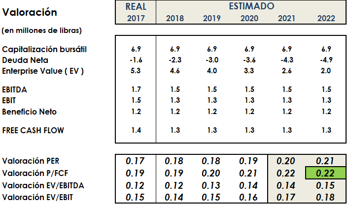 Vamos con la valoración. En esta ocasión, he aplicado un no crecimiento de sus ingresos (+0%) y el promedio de márgenes de 5 años. Por tanto, nos encontramos con una valoración que no varía de aquí al 2022 (a excepción de la caja), lo cual la hace particularmente atractiva. Así, tomando un FCF de 1,3 millones de libras y aplicando unos múltiplos bajos teniendo en cuenta la ciclicidad del sector y la baja calidad del negocio, he estimado una valoración por encima de los 20 peniques frente a los 8,5 a los que cotiza a día de hoy.