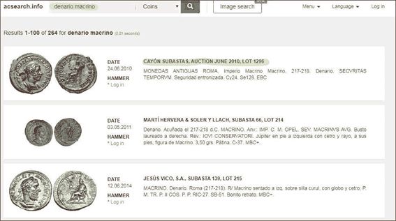 Este agregador de subastas numismáticas permite buscar por palabra clave en la caja de búsqueda. En nuestro caso buscaremos una moneda romana.