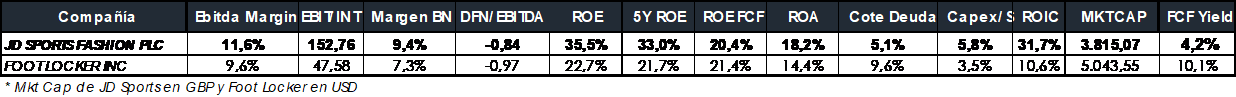 Su competidor principal a nivel mundial es la cadena americana Foot Locker y donde como vemos en la siguiente tabla, JD Sports es claramente superior excepto en términos de márgenes de flujos de caja libre por lo comentado anteriormente, aunque, a pesar de la excesiva inversión en capital de JD, genera casi el mismo ROE FCF que Foot Locker: