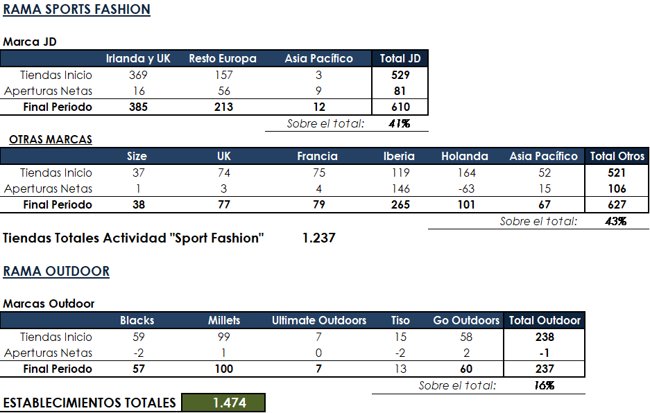 La marca JD ha experimentado un crecimiento de un 15% en número de tiendas físicas donde su núcleo duro se establece en UK e Irlanda pero claramente se está apostando más por la expansión por Europa y por Asia de la marca principal JD pero está habiendo una expansión de todas las marcas por todo Europa que se prevé desde la compañía que siga en aumento en los próximos años lo cual es una estrategia óptima para el crecimiento orgánico de la compañía que complementándolo con el crecimiento mediante adquisiciones como la reciente de Sport Zone y la anunciada en el mes de marzo de la oferta realizada por la americana “The Finnish Line” principal competidora de Foot Locker en Estados Unidos por 558 millones de dólares y con aproximadamente 950 establecimientos repartidos por todos los EEUU con 375 de ellos bajo concesiones con la cadena de grandes almacenes Macy’s lo cual hará a JD entrar en el mercado estadounidense.