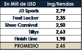La última fila (Valoración Rápida) hace referencia a si el valor es mejor que la media (verde) o si es peor a esta (rojo), donde se ratifica que en todos los campos es mejor que la media excepto en el aspecto de “capex sobre ventas” donde presenta un dato peor al del sector debido a la política de expansión de la red de venta y de logística que la empresa está llevando a cabo mediante aperturas de nuevas tiendas y centros logísticos y seguirá llevando a cabo en el medio plazo como ya he comentado que conllevará a que la empresa genere más valor en los próximos años. Si finalmente se materializa la compra de Finish Line se deberá llevar a cabo una inversión extra de capex que para esta compañía se estima en 40 M$ más la correspondiente para acondicionar los establecimientos existentes del grupo al modelo de JD Sports.