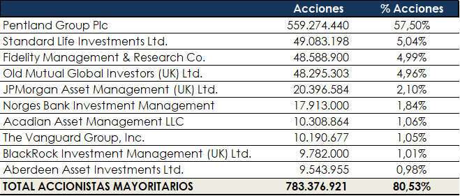El principal accionista de JD Sports Fashion PLC con una posición de control del 57,5% es el grupo “Pentalnd”, la cadena retail británica propietaria de marcas como Speedo, Berghaus y Red or Dead entre otras, así como tenedor de licencias globales o nacionales de marcas como Ted Baker o Lacoste Footwear.