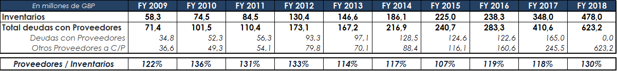Finalmente, en lo que a rentabilidad y márgenes se refiere, cabe hacer mención a para mí uno de los aspectos más importantes que es la generación de flujos de caja libre “Free Cash Flow” donde la compañía a pesar de llevar cabo políticas intensivas en capital en los últimos años donde está llevando a cabo inversiones para mejorar la rentabilidad y capacidad futura de sus negocios, y donde por ejemplo, este año ha destinado 40 M£ (20% del capex) en la fabricación de un centro logístico en Alicante para abastecer a más de 450 establecimientos de su marca “Sprinter” y donde se prevén futuras inversiones adicionales para aumentar la capacidad de abastecimiento de la misma por no mencionar la política de apertura de nuevas tiendas que prevé seguir realizando.