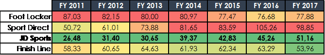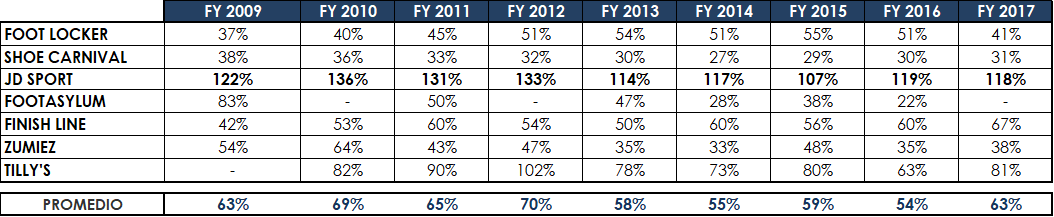 Como vemos, en términos de rentabilidad, la compañía es líder del sector, mostrando unas rentabilidades muy por encima de sus competidores más directos dedicados a la venta multimarca de marcas líderes, pero hemos podido observar como los datos de rentabilidad de JD Sports, se acercan más a los que generan los propios fabricantes (y al mismo tiempo proveedores de stock de la compañía) que no a los de sus competidores directos.