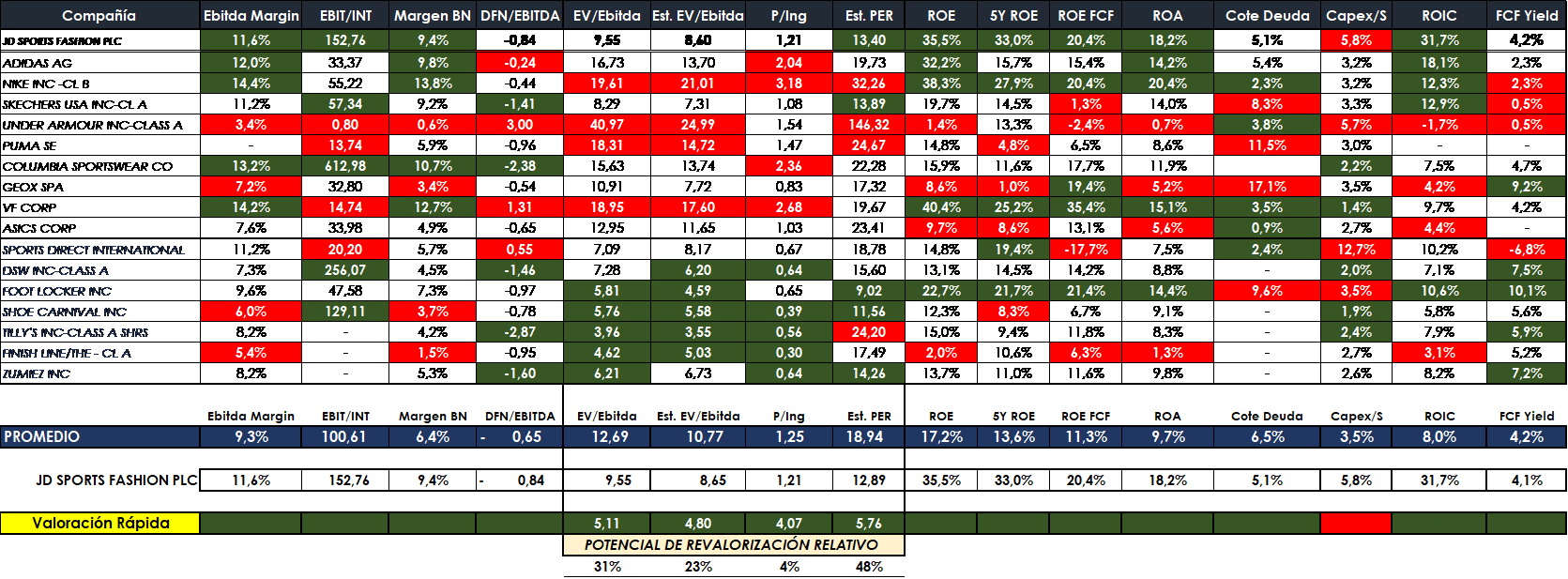 Para llevar a cabo una valoración relativa rápida de cualquier compañía en relación con sus competidores o comparables suelo utilizar algunas plantillas automatizadas que yo mismo he ido elaborando donde puedo ver una visión global de cómo está la compañía respecto el sector, para el caso de JD Sports el resultado fue el siguiente: