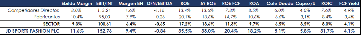Hemos visto que se trata de una compañía estupenda (bajo mi punto de vista) con una deuda muy reducida, un equipo gestor muy eficiente enfocado en el crecimiento eficiente y enfocado en dar valor al accionista invirtiendo rentablemente los flujos de caja generados por la compañía aparte de repartir un pequeño dividendo. Los ratios de rentabilidad son los mejores de todo el sector doblando la media de los comparables y unos márgenes excelentes (los mejores entre los comparables), insisto en lo más que buenos que son los márgenes de la compañía que su negocio “core” no es más que comprar productos a los grandes fabricantes (Nike, Adidas, Vans, Under Armour...) y luego venderlos mediante sus redes de distribución especializadas de valor añadido como la mejora de la experiencia del consumidor, haciendo esto, JD Sports saca más rentabilidad y márgenes que los propios fabricantes y al mismo tiempo proveedores de la propia compañía.