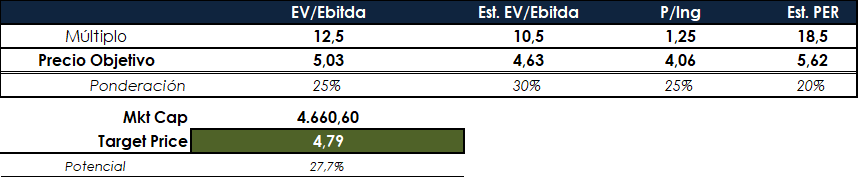 Viendo los precios objetivos en base a los múltiplos comparables ajustado podemos sacar el precio objetivo en base a un promedio de los precios objetivos ponderados por importancia del múltiplo, dado que, por ejemplo, bajo mi punto de vista es más importante (o al menos más ajustado) valorar una compañía en base a su Beneficio Operativo Bruto (EBITDA) que no en base a unos ingresos por lo que los ratios EV/ebitda ponderarán más que no el de P/ingresos como vemos a continuación: