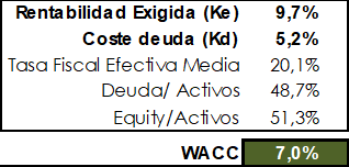 Seguidamente habrá que calcular la tasa de descuento de estos flujos de caja, (el famoso WACC) mediante la cual se ha calculado también el Valor Residual (VR) que vemos en la tabla anterior.