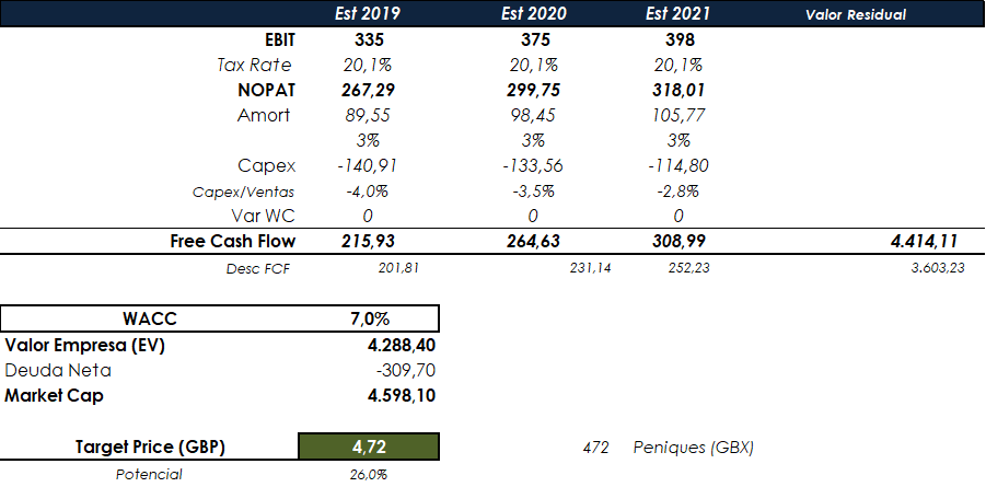 Otorgando los potenciales de la tabla anterior donde al que le damos más importancia es al del EV/Ebitda estimado el precio objetivo por múltiplos rondaría los 4,79 GBP la acción o 479 GBX (peniques) que es la divisa en la cual cotiza la acción en la Bolsa de Londres a 375 GBX (día 17/05/2018), lo cual, es un potencial cercano al 28% mediante múltiplos comparables.