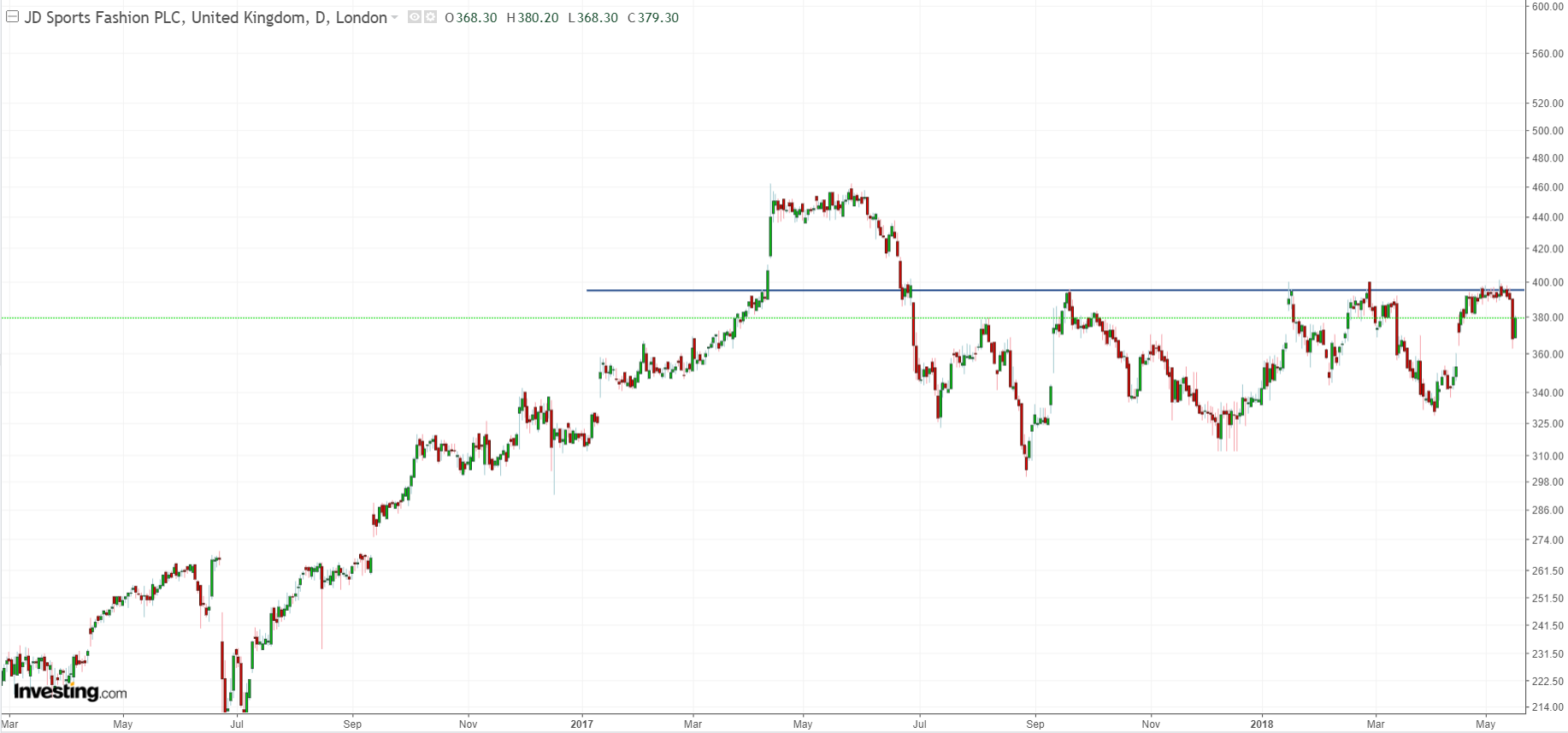 Como vemos, actualmente la compañía se encuentra cerca de una importante resistencia (en los 395 GBX), que necesita de un sólido catalizador para romperla, en abril del año 2017 rompió esta resistencia al presentar unos resultados mejores de lo esperado para el año 2016, más tarde, esta resistencia convertida en soporte se volvió a romper a la baja en el momento que JD Sports alertó de un posible estrechamiento de los márgenes derivados de su política de expansión y adquisiciones como por ejemplo la después anunciada y de la cual ya hemos hablado "The Finish Line". Este factor, de nuevo hizo situar a la acción por debajo de esta resistencia de los 395 GBX que no ha conseguido romper desde entonces, habiéndola alcanzado en cuatro ocasiones, donde actualmente está aguantando parece ser a la espera de, como digo, algún posible catalizador que haga romper esta resistencia o que por el contrario la acción vuelva a corregir como lo ha hecho las tres veces anteriores, en este caso, la estrategia sería comprar la acción si rompe los 395 GBX más un margen de 2% por ejemplo (alrededor de 400-405 GBX) o esperar si corrige a la baja a comprar en un punto más bajo ya que la acción puede llegar a niveles de 330-340 GBX y cerrar el gap alcista que realizó a mediados del mes pasado, ya que al día siguiente de haber tocado los 395, corrigió casi un 6% situándose en los 377 GBX actuales, si llegara al siguiente soporte de 330-340 GBX, la acción podría tener un potencial superior al 40%.