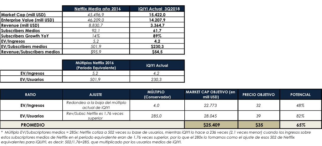 Con unos ingresos estimados de alrededor de ¥36.488 ($5.390M) y considerando los múltiplos actuales de Iqiyi podemos aproximar el precio objetivo (conservador) de cara a este 2019, como vemos en el siguiente gráfico, que, al mismo tiempo, comparamos con los mismos múltiplos de cotización de Netflix en el periodo equivalente al actual de Iqiyi, fue en el año 2016 donde Netflix tuvo unos usuarios medios de 92,1M comparados con los 94,1M estimados [(107,6+80.7)/2] para Iqiyi a 3Q.2019: