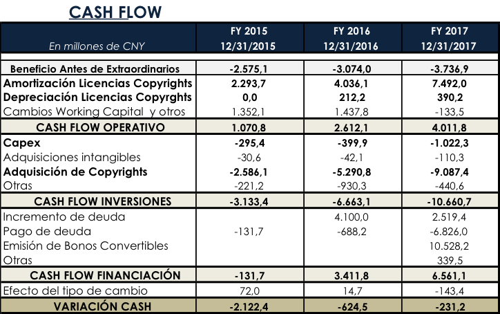 En una compañía como Iqiyi, en el corto plazo debemos centrarnos en que la compañía tenga una buena base de subscriptores, y como digo, consolidar su liderazgo, para poder generar ventajas competitivas a través de la cuota de mercado resultante y el mayor poder de negociación con terceras productoras y los costes asociados a la propia productora de Iqiyi, que a través de ese incremento de la base de usuarios y poder de negociación, puede permitir a la compañía a generar márgenes positivos al tener capacidad para subir los precios(actualmente bastante reducidos) y reducir sus costes que en gran medida vienen dados por la amortización de los derechos de autor o Copyrights, que con una vida útil media de 2,5 años, suponen una elevada amortización anual (por este motivo los FCF son positivos).