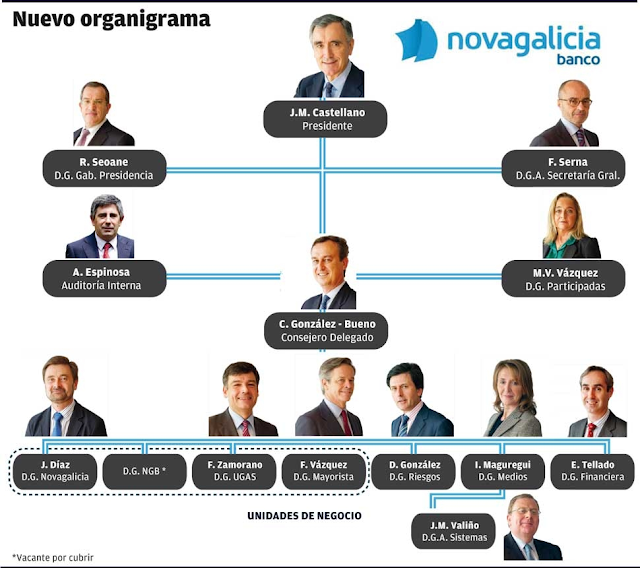 Con la creación de NGC Banco, S.A. se produjo un cambio en el órgano de gobierno de la nueva entidad. Si al principio estaban al frente los directivos procedentes de Caixanova Pego y Gayoso, Núñez Feijóo decidió confiar en José María Castellano para dirigir la nueva entidad, y apartar al antiguo equipo directivo. De hecho, con Castellano al frente se sustituyó gran parte de la dirección procedente de Caixanova (la caja con mejor gestión) por directivos de Caixagalicia (la caja que se había llevado a la quiebra), haciendo que NCG empezase a virar hacia el norte de Galicia en detrimento del sur, saltándose todos los acuerdos de paridad alcanzados con intermediación de Feijóo.