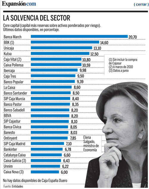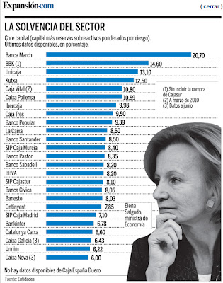 Sin embargo, a nivel español el Ministerio de Economía (con Elena Salgado al frente) aprobó el Decreto de Solvencia, fijando criterios más estrictos para cajas y bancos en nuestro país. El % mínimo de representación del patrimonio neto debía ser en este caso de un 8% para bancos, y de un 10% para las cajas de ahorro antes de 2013, hecho que se lo ponía aun más difícil a la mayoría de entidades financieras españolas. La intención de la medida era garantizar la solvencia de las cajas y bancos españoles, pero en la práctica ésta solo sirvió para restringir aun más que el dinero fluyese de los bancos a las empresas, estrangulando más la maltrecha economía española, y dejando a nuestro sistema financiero en inferioridad de condiciones respecto al resto de Europa y del mundo.