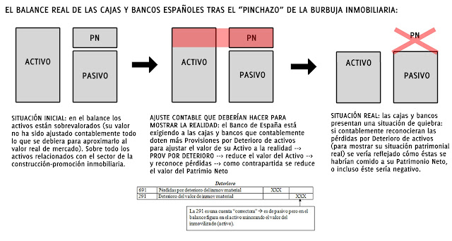 Cuando la crisis estalló en España con toda su virulencia, el valor de todos esos activos se vió fuertemente mermado. Muchas promociones se paralizaron, el valor de los solares se redujo sensiblemente, muchos terrenos no fueron recalificados ni aptos para ser construídos, se produjo una gran contracción de la demanda, un incremento de la morosidad, la quiebra de muchas empresas constructoras-promotoras…