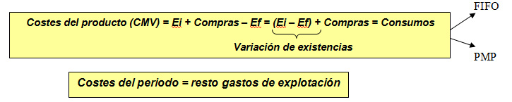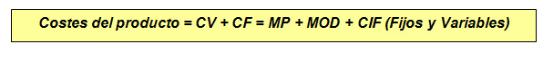1) Costes del producto (o coste de la mercancía vendida -CMV-): son aquellos costes que se reconocen como directamente imputables al producto fabricado. Son por tanto los costes variables (CV) de la empresa, y según el criterio elegido para efectuar la imputación de costes, pueden ser también algunos costes fijos (CF).