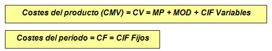 2) Costes del periodo: son aquellos costes que se identifican como fijos (CF) y que por tanto no son imputables a priori al producto fabricado. Por descarte, son el resto de costes que no han podido ser clasificados dentro de los "costes del producto".
