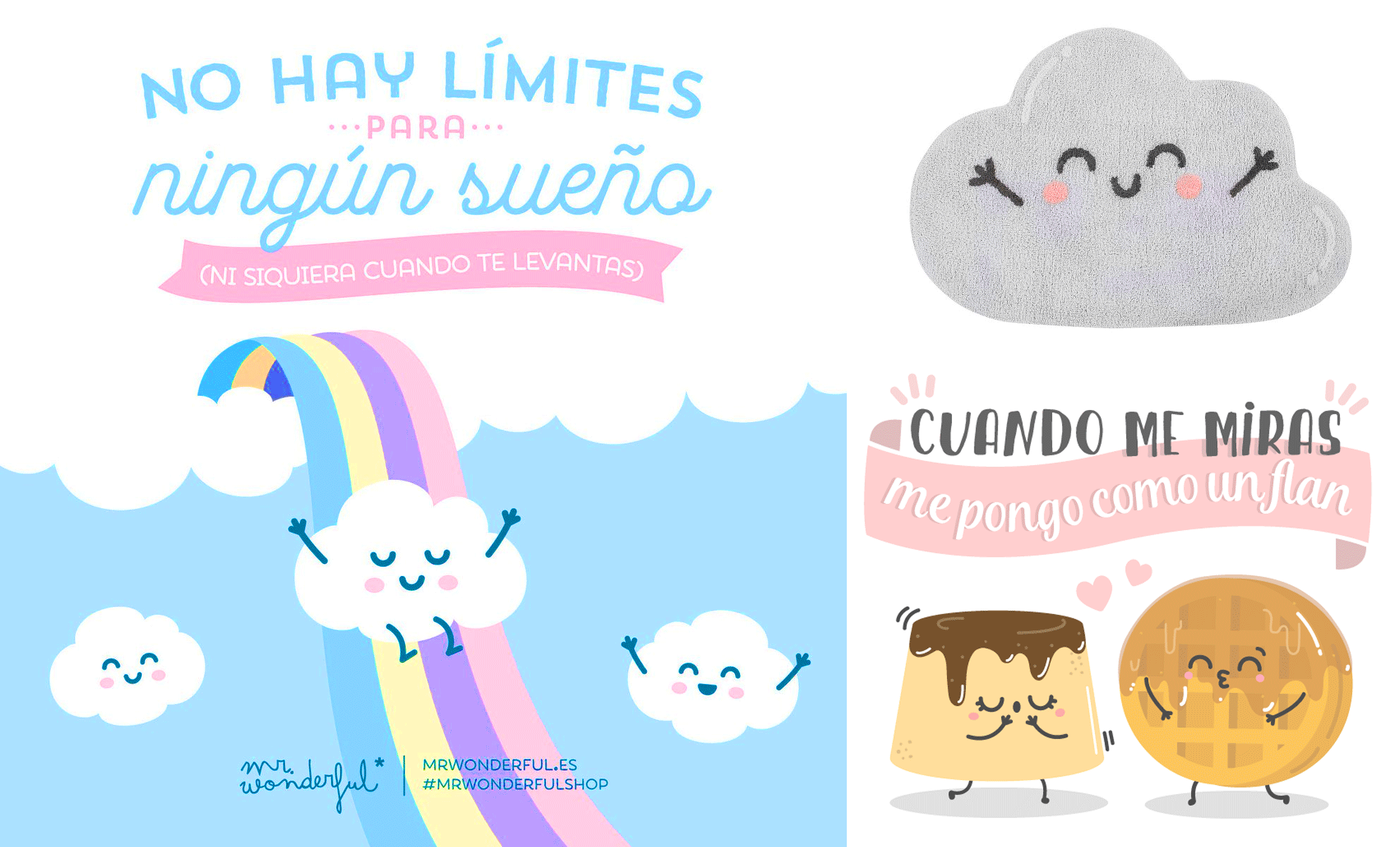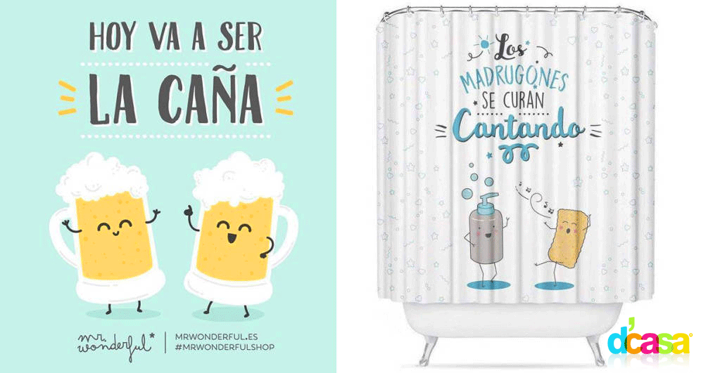 Nubes sonrientes y otros objetos con vida, mucho color pastel y mensajes cargados de buen rollo escritos con tipografías amables y redondeadas: la tradicional estética empleada por Mr Wonderful era también utilizada por Dcasa para decorar cortinas de ducha, relojes, cojines, etc.