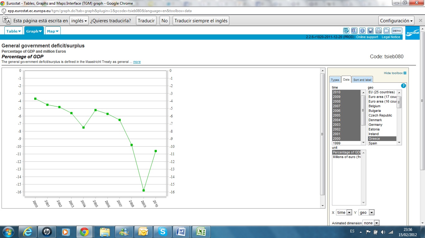 El caso es que parece un poco extraño que la unión europea sea tan fácil de engañar, ya que se supone que en Bruselas tienen internet. Como no parece demasiado probable, y ante la tesitura de ir año por año tratando de recopilar datos, me ha parecido mucho más correcto irme a la página de eurostat y ver cuáles son los datos que tiene la Unión Europea de Grecia. Yo creo que tampoco tiene tanto mérito o por lo menos no es lo que se entiende como periodismo de investigación, sino que por lo menos cuando alguien acuse a un país de mentir a la UE en un medio de comunicación debería comprobar que es lo que ha dicho a la UE, o lo que es lo mismo ¿cual es la información que tiene la UE de las cuentas de Grecía a lo largo de estos años?. (por aquello de ver si han sido engañados o eran conscientes de unas cuentas dramáticas). El que quiera trastear tiene el link de la base de datos estadística de eurostat en este enlace http://epp.eurostat.ec.europa.eu/portal/page/portal/statistics/search_database, desde el que obtiene todos los datos.