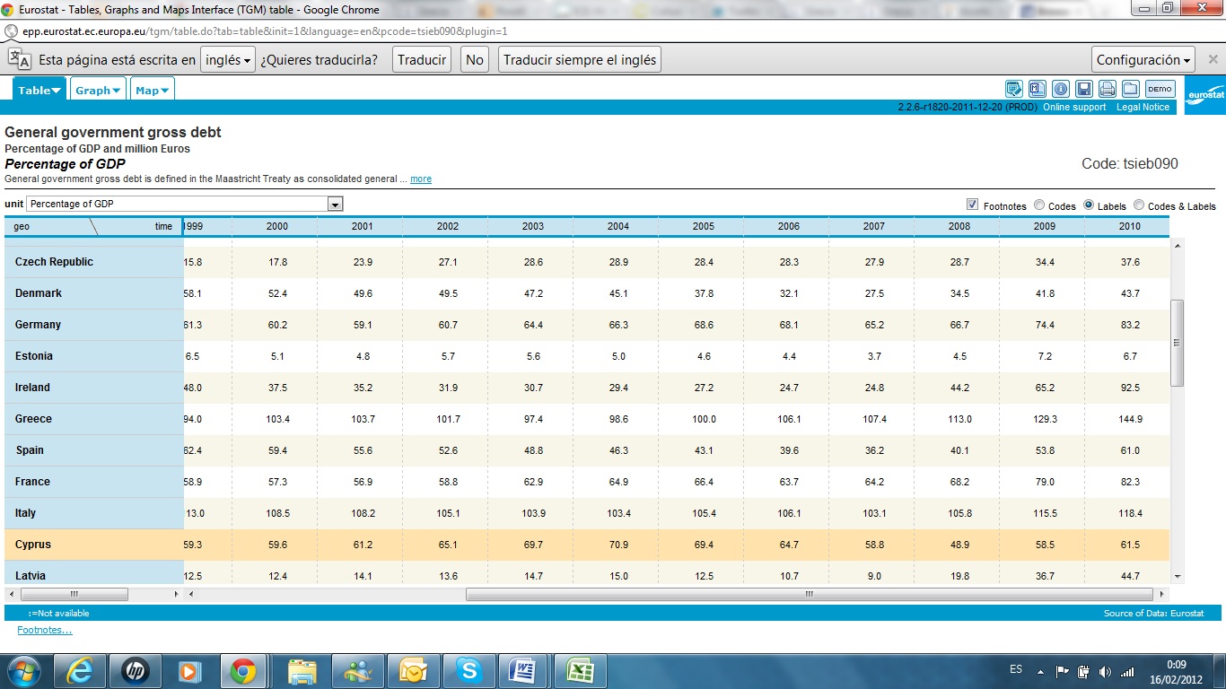 Pues nada, recomiendo que desde esta página, busquemos el link “budget” en “economic data”, y se descarga en la parte derecha el del año que nos dé la gana, especialmente en el período en el que se supone que se estaba engañando a la unión europea. En cualquiera de ellos nos encontraremos un déficit que se espera que cumpla,(y ojo que la palabra clave está en que se espera), a la vez que una deuda que siempre ha estado en torno al 100% del PIB. Repito, sea el que sea.