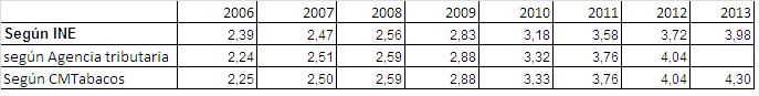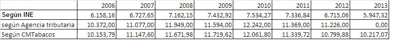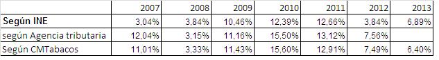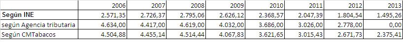 Visto de otra forma; el INE estima que se consumen el 58% de los cigarrillos que se consumían en 2006 (nos daría un ajuste del 42% en la demanda de cigarrillos en todo el período); el CMTabaco afirma que se consume el 52,71%, lo que supone un ajuste de casi el 50%.