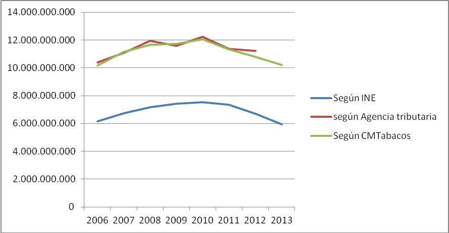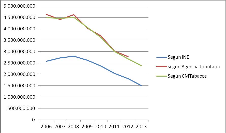 Los resultados son bastante clarificadores; mientras la agencia tributaria y el comisionado de tabacos estiman que se va reduciendo el consumo de cigarrillos (con un ligero repunte en 2008) a lo largo de todo el período; el INE estima que el consumo de tabaco sube hasta el año 2008. De hecho, los resultados para 2013 son desconcertantes. El consumo de cigarrillos recogido por el Comisionado para el Mercado de Tabacos multiplica por 1,58 el dato ofrecido por el INE.