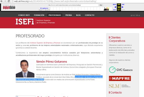 Dudaba que fuese el “único fundador” desde el momento en que había dos fundadores adicionales. En todo caso, resulta curioso que tirando de las herramientas de archive.org podemos controlar toda la evolución de la web de ISEFI; En mayo de 2014 lo que mostraba en el apartado profesorado es un cargo distinto al de Director Académico del Instituto: