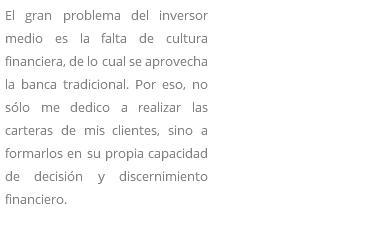 “me exijo unos pilares irrenunciables, que rigen la relación con todos mis clientes: la independencia, la formación de calidad, y la transparencia personal y profesional. Sólo así puedo superar los ejes bajo los cuales la banca tradicional ha basado su modelo. Esto es, la falta de cultura financiera y las campañas comerciales forzosas por falta de independencia de sus asesores; todo ello sazonado con una total carencia de claridad sobre los riesgos, y/o beneficios implícitos”
