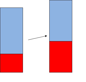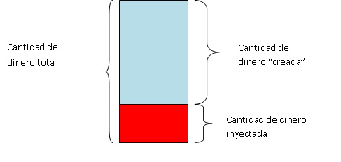 En definitiva estamos hablando de que mediante el proceso de creación de dinero, la cantidad de dinero en la economía es igual a la base monetaria por el multiplicador monetario. De forma que cuando hablamos de inyecciones monetarias, (imprimir billetes), nos encontramos con una actuación que afecta a la zona marcada en rojo, que es la que se incrementa.