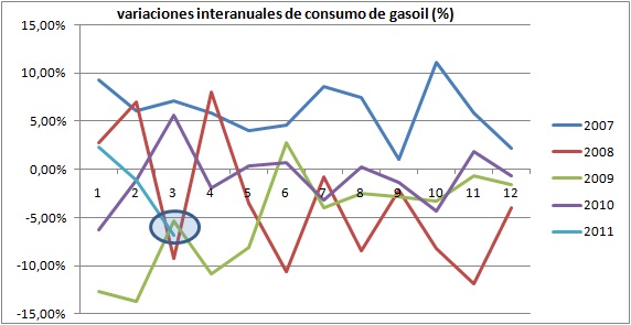 Pues resulta que en 2010 el pico de consumo fue en Marzo; que fue el segundo mes del año con mayor consumo de carburante (tras julio) y muy superior al resto de los meses. En consecuencia cuando comparamos marzo de 2011 con marzo de 2010, tenemos que tener en cuenta que estamos comparando situaciones muy distintas.