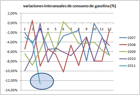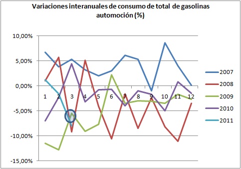 En consecuencia, si en abril de 2011 el consumo de gasolinas no tiene una subida importante, lo que supondría es que el consumo en abril de 2011, sería menor que en marzo de 2011, de tal forma que estaríamos ante una situación de derrumbe total de la economía como la acaecida en el primer semestre de 2009.