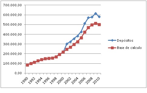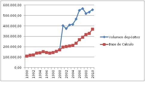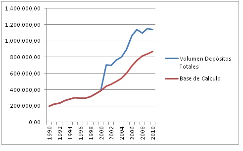 Sin embargo, si defendemos que la bajada de los porcentajes de aportación ha sido la primera reducción de las aportaciones de las entidades al fondo, estaríamos equivocándonos; en 2001, se produjo la primera gran rebaja de las contribuciones a los fondos de garantía de depósitos. Esta rebaja no se vendió como tal, sino que fue una modificación de los criterios de contabilización de las bases de cálculo para las aportaciones del FGD. La primera modificación de las aportaciones ha provocado unos efectos sustanciales que podemos ver en un gráfico en el que comparamos las evoluciones de los depósitos y de la base de cálculo: