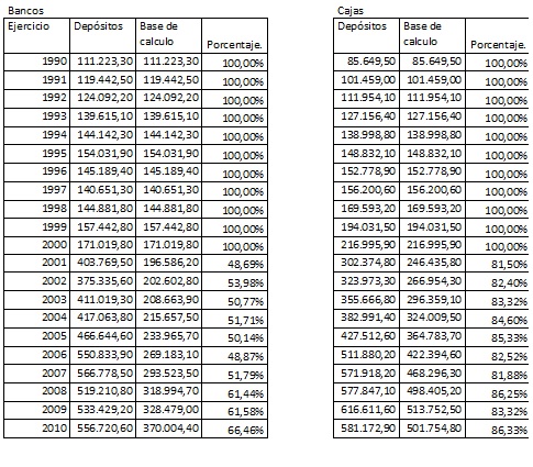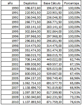 Si lo queremos ver en cifras, (todas en millones de euros), se puede ver en la siguiente tabla donde aparece el total de depósitos en las entidades financieras, las bases de cálculo para las aportaciones del Fondo de Garantía de Depósitos y el porcentaje que suponen las bases sobre el total de depósitos.
