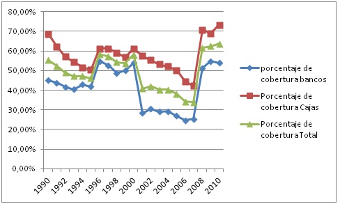 En esta gráfica se comprueba fácilmente también que el porcentaje de cobertura, (las garantías efectivamente asumidas), se han ido reduciendo desde el 2001; hasta la ampliación de 2008, que evidentemente supone un ajuste necesario, pero que no se ve acompañado de las aportaciones, por lo que el riesgo del Banco de España, (nosotros) se incrementa.