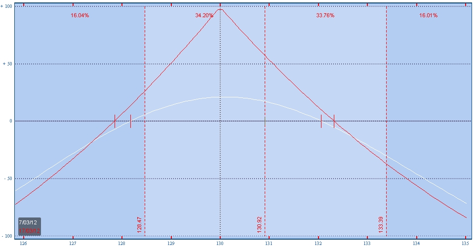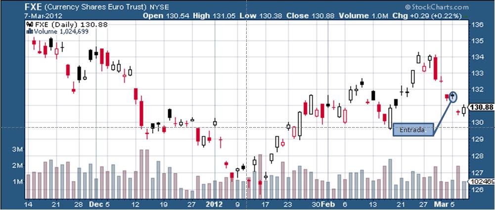 Según se indicaba en el punto 4 del post del pasado jueves, “el lunes, anteayer, fuera cual fuera el subyacente elegido y estuviera como estuviera, abriríamos nuestra estrategia". Abrir una estrategia en la situación en la que se encuentra FXE es realmente complicado. Se encontraba a mitad de camino entre 134 y 130, justo lo que nunca buscaría en la entrada en una posición. Al final me decidí por una Put Calendar Mar12 Jun12 Stk 130 de coste $ 271 por contrato, según comentario nº 38.