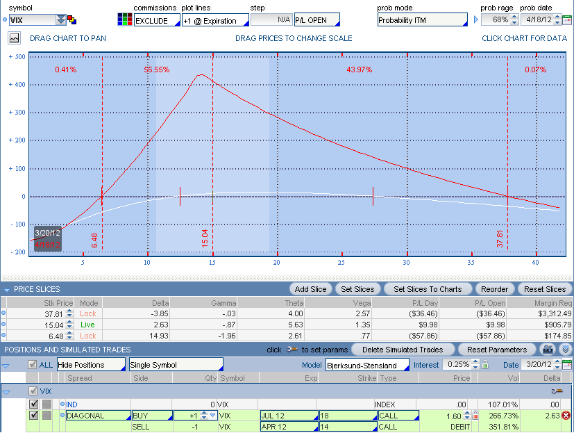 Ayer finalmente abrí nueva posición en el VIX. Al igual que en noviembre hice mi análisis y vi claramente el VIX bajista hasta Abril, esta vez también lo he hecho y no lo veo nada claro. No sé que va a hacer el VIX pero tampoco importa mucho. Las opciones nos permiten un nivel de flexibilidad espectacular, esta flexibilidad nos permite diseñar una posición con la que nos sintamos cómodos en el mercado.