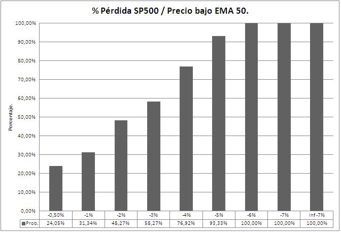 El siguiente gráfico relaciona el número de descensos o pérdidas diarias, expresadas en porcentaje, del índice SP500 en los últimos 20 años. La escala de descensos porcentuales va desde -0,5% en adelante y se ha representado en el eje horizontal. En el eje vertical se ha representado la probabilidad de que ocurra esa pérdida si el precio se encontraba el día anterior al descenso por debajo de la EMA 50 (Exponential Mov. Avg. de 50 días).
