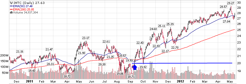 Para el ejemplo, nos centramos en Intel (INTC). Suponemos que el precio de compra fue una media aproximada de esos 3 meses, alrededor de los $22.00. Actualmente cotiza en $27, lo que supone un retorno del 22.7% en 9 meses (30% anualizado), lo cual es una excelente cifra. Debemos tener en cuenta que se ha beneficiado de toda la tendencia alcista, por lo que estaríamos analizando un caso muy favorable para el VI.