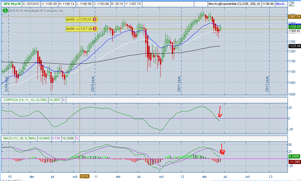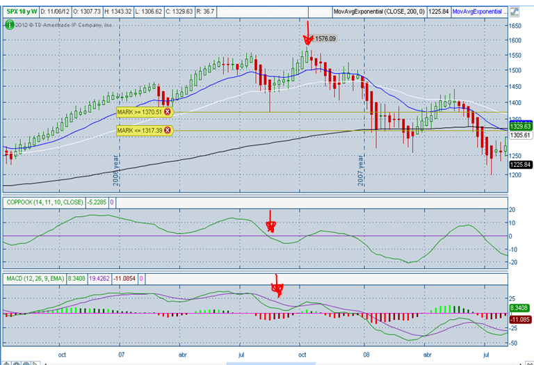 Si miramos el siguiente gráfico (gráfico semanal del S&P500), vemos como después de hacer máximos, el mercado entró en el mercado bajista del 2008-2009. Lo que debemos observar es cómo algunos indicadores ya estaban mostrando la ralentización de la tendencia. En la imagen vemos el MACD y el indicador de COPPOCK en zona negativa: