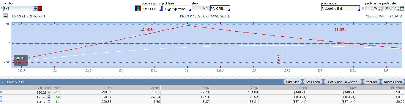 Como vengo publicando, tenemos abierta una operación ajustada en FXE, que de momento ha aguantado bastante bien, a pesar de que la subida del pasado viernes fue con disminución de volatilidad implícita. Esta operación es una Put Calendar DEC JUL 121 124. Posiblemente, si el precio corrige tengamos que ajustar. El vencimiento de julio se está acercando y todavía la posición no tiene beneficio, esto quiere decir que vamos a tener que operar en la semana de expiración, algo que procuro evitar cuando es posible. La semana de expiración amplifica en Profit/Loss los movimientos del precio y las variaciones de volatilidad. No me gustaría alargar la operación al siguiente vencimiento, pero todo es posible.