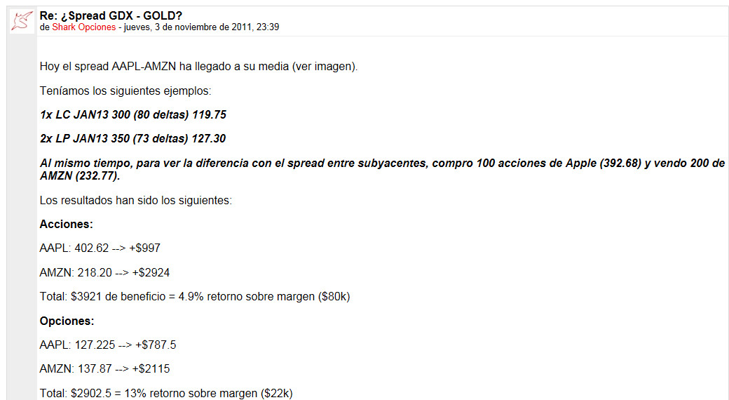 Actualmente, después de las fuertes caídas de AAPL y de la fuerte subida de AMZN, este spread se encuentra a casi 3 desviaciones estándar. Si te da miendo comprar AAPL o te da miedo poner 'shorts' en AMZN de forma directa, una forma más segura es hacer un spread neutral comprando y vendiendo a la vez.
