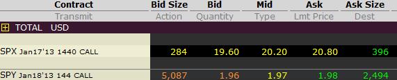 Por un lado podrías negociar el SPX Long Call JAN13 con una horquilla de $1.2 y por el otro el SPY Long Call JAN13 con 0.02 de horquilla. Dependiendo de varios factores elegirás uno u otro y tendrá consecuencias en tu operativa, no sólo en las comisiones, sino también en el número y tipo de ajustes que tengas que realizar. Es necesario tener en cuenta la prima, la horquilla y la comisión, y minimizar costes. Es hora de hacer cuentas!!!