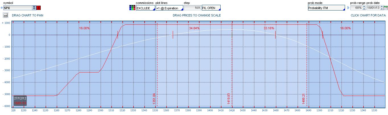 Como ejemplo te dejo una "Trend Iron Condor" del SPX (S&P 500) que se ha aprovechado de las últimas caídas. Está siendo una operación problemática, de esas que el beneficio se hace lentamente. A pesar de que se ha aprovechado de las últimas bajadas del mercado, la subida de volatilidad no ha ayudado nada. A cierre de ayer tiene un beneficio aproximado del 9% y un beneficio máximo del 17%, pero lo ideal sería cerrarla en dos semanas aproximádamente. La estrategia ha tenido dos ajustes y como se puede comprobar los beneficios están intactos.